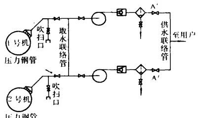 ②圖2中無論哪臺水泵作為工作泵都只有與之對應(yīng)的一個工業(yè)濾水器(反沖洗排污式濾水器)參加工作。這樣,水流經(jīng)工業(yè)濾水器(反沖洗排污式濾水器)的流速為圖2的2倍,凈水效果較差。而且圖2中從取水連續(xù)滿載運行要求,每年可為電站挽回過去被迫降荷運行的經(jīng)濟(jì)損失4萬多元,減少軸瓦維修和停機(jī)損失0.8萬元,創(chuàng)造了較大的經(jīng)濟(jì)效益。簡單適用,易于推廣。本系統(tǒng)簡單,所需元件口流入的污物除閥A外,其它閥件和水泵都未得到保護(hù)。