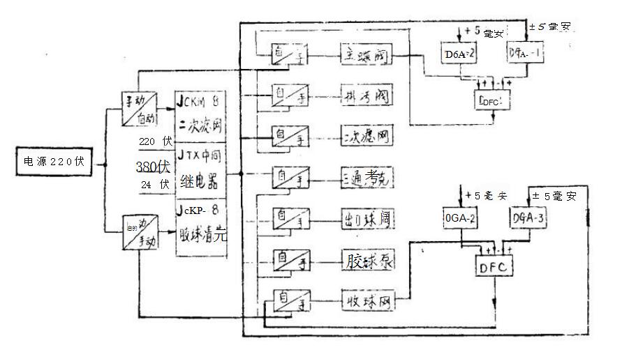 自動程序控制系統(tǒng)是由程序控制器JCKM-8發(fā)出時間程序指令,通過中間繼電器來控制DFD-09電動操作器達(dá)到啟動和停止電動DKJ系列執(zhí)行機構(gòu),開啟和關(guān)閉、運行和停止閥門和電動泵,使凝汽器二次濾網(wǎng)和膠球清洗按預(yù)定的時間和程序進行清洗。