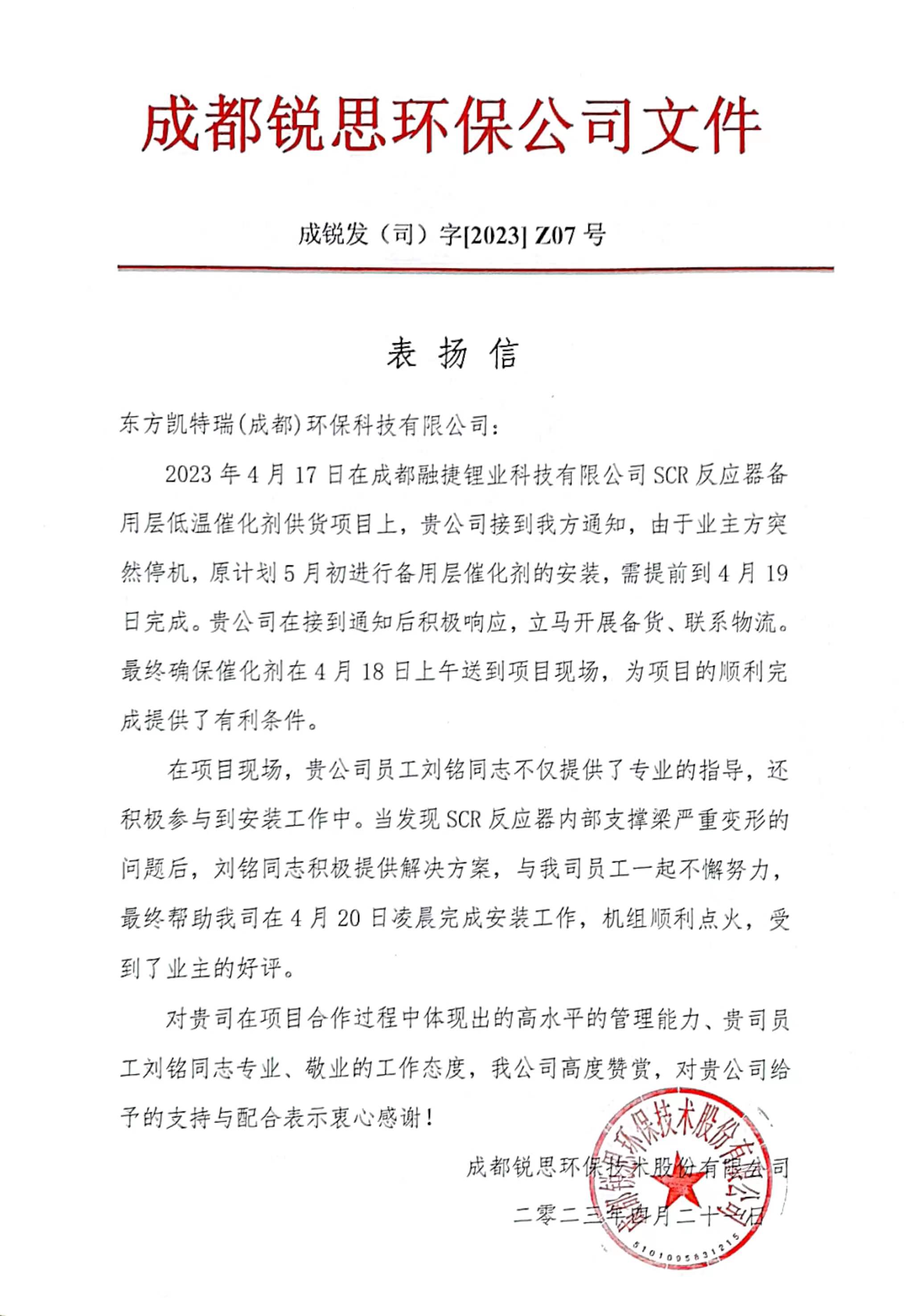 4月17日,接到項(xiàng)目合作方成都銳思環(huán)保技術(shù)股份有限公司的通知,由我公司5月上旬供貨的成都融捷鋰業(yè)科技有限公司SCR低溫脫硝催化劑項(xiàng)目,因業(yè)主方設(shè)備提前停機(jī)需4月19日安裝的要求。 用戶的需求就是命令,接到業(yè)主提前交貨安裝的通知后,急用戶之所急,市場項(xiàng)目部立即行動,項(xiàng)目負(fù)責(zé)人以最快的速度組織備貨,聯(lián)系物流,18日將該項(xiàng)目產(chǎn)品發(fā)運(yùn)至項(xiàng)目現(xiàn)場。 為了保證工期,做好現(xiàn)場服務(wù),市場項(xiàng)目部安排業(yè)務(wù)過硬、責(zé)任心強(qiáng)的劉銘同志第一時間趕到現(xiàn)場協(xié)助業(yè)主收貨、驗(yàn)貨,盡職盡責(zé)指導(dǎo)催化劑模塊安裝工作,全程進(jìn)行技術(shù)指導(dǎo)與交底,在過程中發(fā)現(xiàn)并解決了反應(yīng)器內(nèi)催化劑支撐梁嚴(yán)重變形的技術(shù)問題,經(jīng)過徹夜奮戰(zhàn),于次日上午順利完成安裝任務(wù),最終確保催化劑安裝如期完成,機(jī)組順利點(diǎn)火。 本次任務(wù)的圓滿完成,充分體現(xiàn)了我公司一切急用戶急,全力為用戶排憂解難的24小時服務(wù)精神。項(xiàng)目合作方和業(yè)主對東方凱特瑞在項(xiàng)目合作中展現(xiàn)的高水平管理能力和項(xiàng)目團(tuán)隊(duì)專業(yè)、敬業(yè)且負(fù)責(zé)的工作態(tài)度給予了高度贊揚(yáng),并發(fā)來表揚(yáng)信表示感謝。