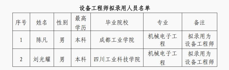 根據(jù)公司人力資源需求計(jì)劃及《人力資源管理制度》規(guī)定,經(jīng)個(gè)人報(bào)名及公司考核,現(xiàn)將東方凱特瑞(成都)環(huán)保科技有限公司設(shè)備工程師擬錄用人員予以公示。