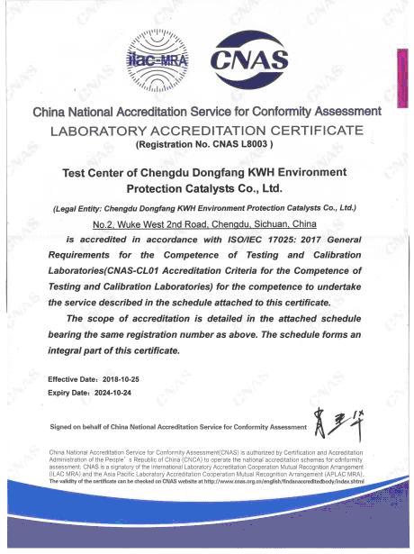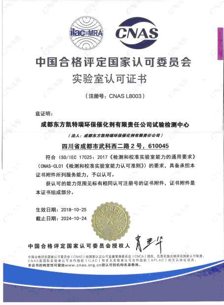 東方凱特瑞試驗檢測中心(以下簡稱中心)成立于2006年,占地面積1500m2,擁有先進的檢測設備和專業(yè)的人才隊伍,并于2015年10月首次通過中國合格評定國家認可委員會認可,獲得CNAS證書(證書注冊號:CNAS L8003),認可范圍全面覆蓋了催化劑產品全尺寸檢測的所有關鍵指標,可為客戶提供高效和專業(yè)的技術檢測服務。